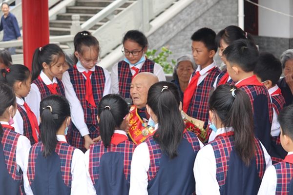 重阳节之际,南上湖校区携手东阳市阳光公益志愿者协会关爱老兵团队带领学生们来到了养老中心。学生们为在场的老人们唱起了嘹亮的国歌。最激动人心的莫过于和抗战老兵乔治民见面互动。乔治民,1928年出生,浙江东阳人。1941年加入辎重兵学校,成为辎重学生大队18期勤务兵。1942年到重庆学修车和开车,日本投降后到北京傅作义部队,1946年部队裁军后回乡务农。五14班张书妍问:“乔爷爷,请问你什么时候当兵?”“14岁。”听到乔治兵的回答,孩子们都惊讶了。“乔爷爷你上战场的时候怕吗?”“当然怕了。”“那怕你为什么还要去当兵?”“为了保家卫国,怕也要不怕!”乔治兵眼神特别坚定。但是,钢铁男儿也有柔情的一面。“去打战的时候,我会特别想家。”乔治民说着说着眼睛有些迷蒙。通过问答的方式,孩子们与老兵共同回忆了惊心动魄的抗战史。听着听着,孩子们十分动容,感慨如今的幸福日子来之不易。老兵们从抗日战争的枪林弹雨中出生入死,前赴后继、英勇无畏的精神值得每一个人学习与传承。