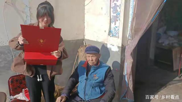 曹老听说我们要来,坐在外门口晒着太阳等着,看见我们到来,连忙起身握手,热情地打招呼,又让搬出凳子让大家坐下,曹老和我们愉快地谈话聊天,笑语不断,曹老看到我们准备拍照,从贴身衣服口袋里掏出带有曹老体温的奖章带上。虽然未言语表达,但我们从曹老脸上感受到了他洋溢出的幸福的笑容。