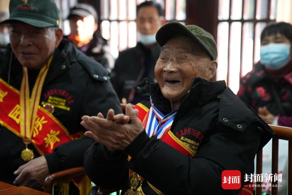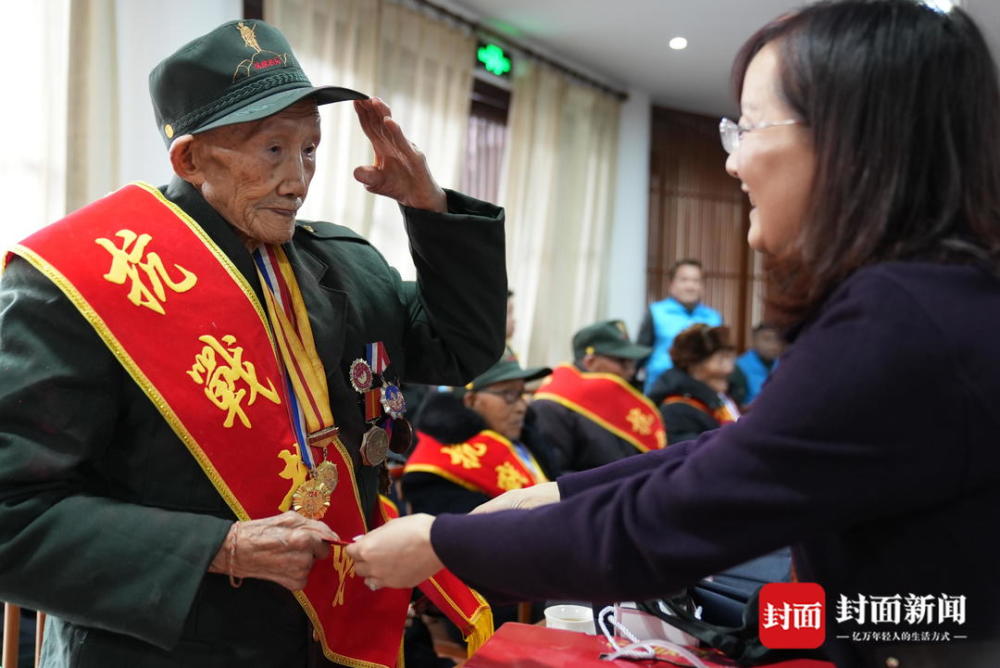 14位代表中,年龄最大的抗战老兵,已经有102岁高龄,最小的也有89岁。在拿到慰问品时,老兵们从椅子上站起身来,敬了个军礼。