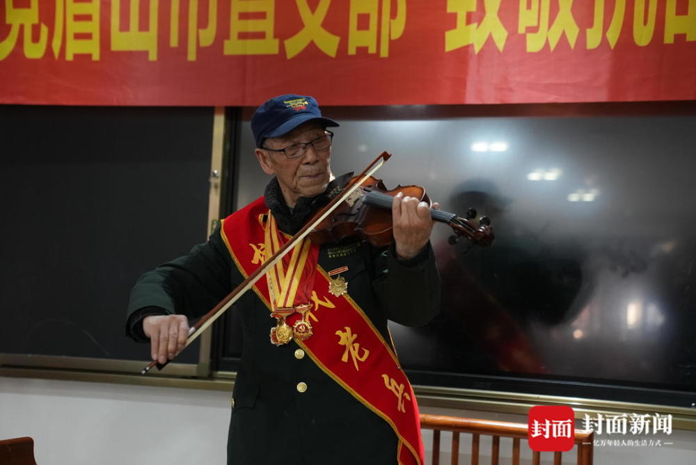 当了几十年文艺兵的刘守阵老人还拿起一把崭新的小提琴,为大家献上了一曲《草原上升起不落的太阳》。据了解,刘守阵一生喜爱音乐,在部队进行慰问表演时,就会用各种乐器伴奏。有一把小提琴也跟了刘爷爷几十年,已经十分破旧了。农工党眉山市直机关支部主委薛莉在活动上,向老人赠了一把新琴。