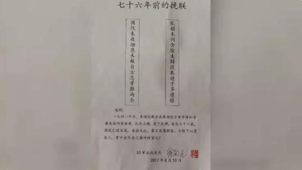 “当天晚上,父亲辗转难眠,含泪写下了一副挽联:‘卧榻未伺,含殓未归,从来游子多遗恨;国仇未復,劬恩未报,自古忠孝难两全。’第二天,父亲买了黑布,为奶奶戴孝。没能伺候有病的母亲,没能在入棺前见上最后一面,成了父亲终生的愧疚。”蒋光复慢慢地叙述着这段让几代人都无法忘却的心痛回忆。