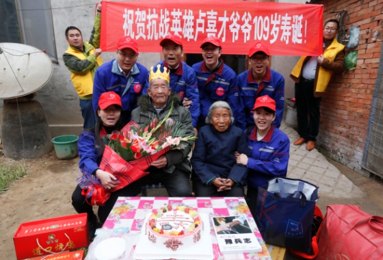 11月6日,是河南年纪最大的抗战老兵卢喜才109岁生日。宇通公司志愿者携带蛋糕、牛奶、棉被等物资驱车200多公里前往濮阳市南乐县为老人贺寿。