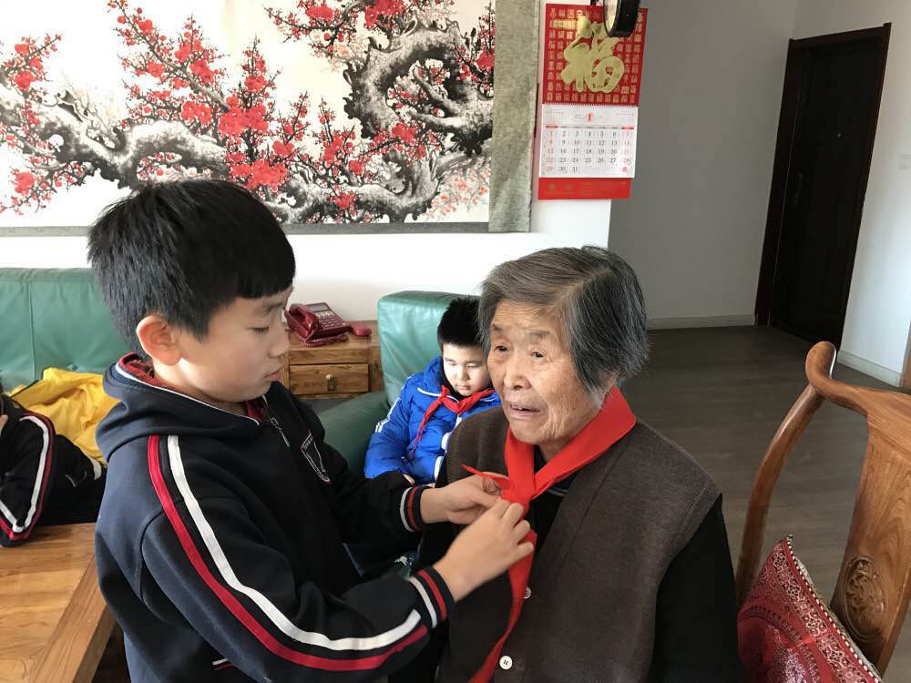 今年寒假,为让学生们亲身感受抗战红色教育,山东师范大学附属小学五年级九班雏鹰小队的同学们利用寒假,组成五人小组去济南军区干休三所慰问抗战老兵,给老爷爷老奶奶们送年货送福送春联,给 抗战老兵佩戴红领巾,听他们讲光荣的革命传统、浴血奋战的抗战故事。老爷爷与老奶奶平均95岁,他们都参加过抗日战争、解放战争、抗美援朝战争,老奶奶给他们看了军委给他们颁发的纪念抗战胜利70周年勋章。