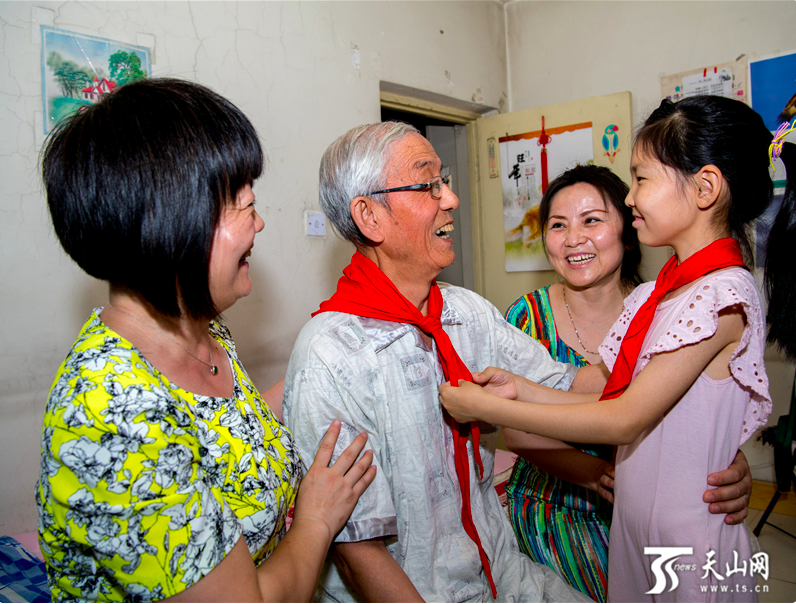 小学生欣卉给王宽老人佩戴红领巾。