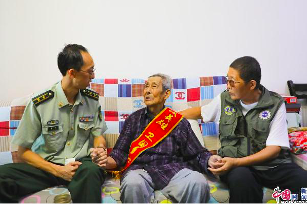 在抗日战争胜利73周年到来之际不久,武警工程大学蒲元教员和12名学员代表看望慰问八路军晋绥军区第17团抗战老兵樊心孝,并赠送“抗战英雄”牌匾和纪念章。