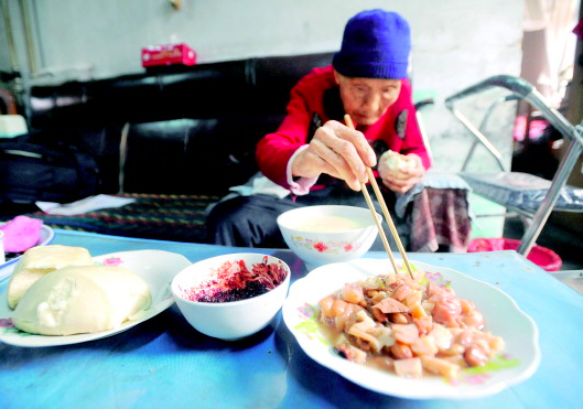 107岁的王淑清老人吃饭从来不挑食,猪蹄儿炖的花生和藕,加上豆腐乳就是她的午餐