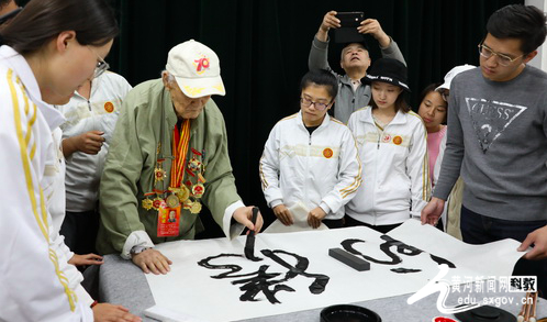 讲座中,已过鲐背之年的孙宗武先生,声情并茂地为大学生讲述了自己的身世、参军的经历。他真实地还原了抗日战争的残酷场面,情到深处发出誓死不党亡国奴的呐喊!在场每一位同学从心底感到触动。孙宗武先生顶着身体的不适,用自己编写的诗歌为在场师生再现了歼灭日本军官观战团180余人的韩略战斗。“孙宗武老先生勇于牺牲个人保家卫国的大无畏精神令我们感动”,现场一位同学认真地说。
