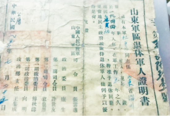 采访中,记者了解到,杜守芬参加过孟良崮战役、济南战役、淮海战役等。1950年,杜守芬因病向部队提出退休申请。