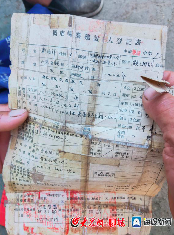 老人将这已经泛黄的回乡转业登记表视如珍宝。