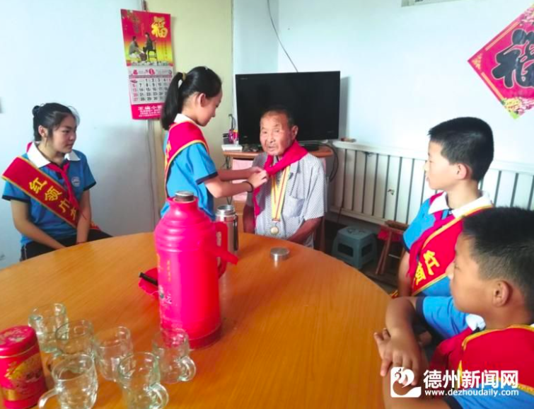 2019年9月3日是中国人民抗日战争暨世界反法西斯战争胜利74周年。在这个纪念日里,有一群特殊的老人总是牵动人心,他们就是抗战老兵。9月2日上午,平原县王庙镇中心小学少先队代表来到王庙镇大务集92岁抗日老战士霍玉生老人的身边,听他讲述抗战故事。“为您系上红领巾。”少先队员们为可敬的抗战老战士佩戴红领巾,并向老兵敬礼,这是对老人最崇高的敬意,感谢霍爷爷为祖国繁荣做出的贡献。霍爷爷嘱托在场的少先队员:“你们一定要好好学习,长大为国家服务!”