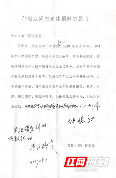 “我一辈子都在做医疗卫生工作,都是在干革命,遗体捐献国家很需要,我要革命到底,最后还做一点贡献。”2019年8月1日,94岁高龄的仲振江来到长沙市第三医院党委办公室,将一份特殊的材料交到医院党委办主任李毅芬手上。