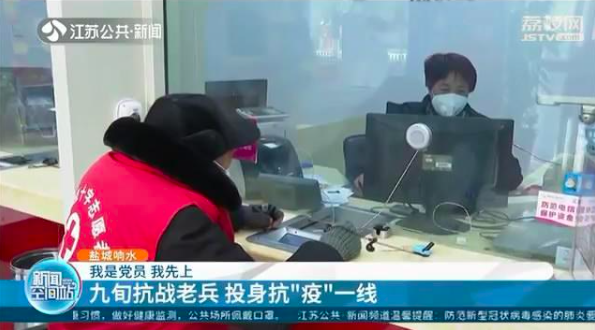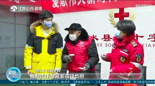 据江苏公共·新闻频道《新闻空间站》报道:近日,96岁高龄的响水县中国好人、抗战老兵周仁甫在大学生志愿者的陪同下,带着存折来到银行柜台,取出10000元现金捐往武汉,支持疫情防控。