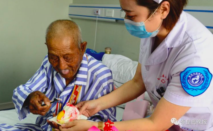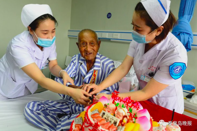 7月1日上午,秦海医院的医务人员和来自卢龙县刘田各庄镇小王柳河村的百岁抗战老兵王瑞成一起庆祝党的生日,并与老人一起重温入党誓词。