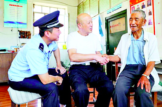 民警吴超帮助王先生(中)找到其老父亲的发小(右)