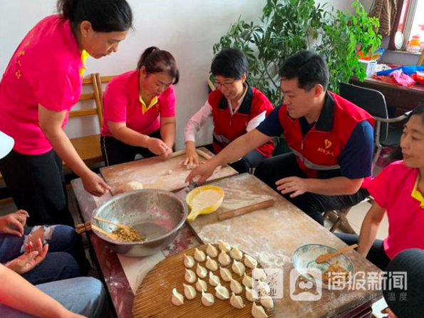 随后工友们开始着手包饺子:有的揉面,有的擀皮,有的包饺子……不一会儿,热腾腾的饺子出锅了,大家与老红军欢聚一堂。