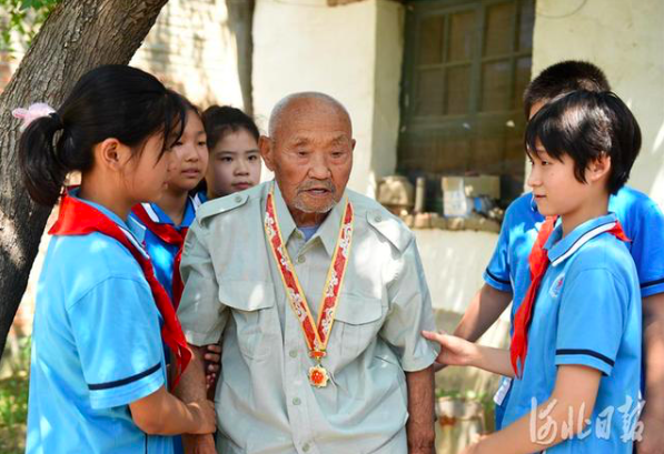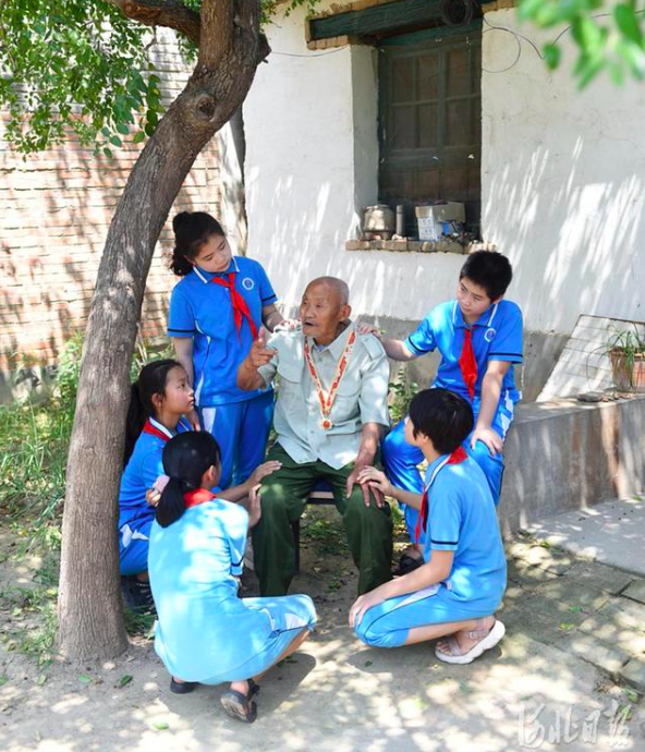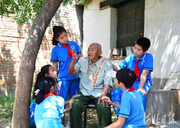 河北省南宫市第一小学学生看望92岁的抗战老兵李光照。河北日报记者赵永辉摄影报道