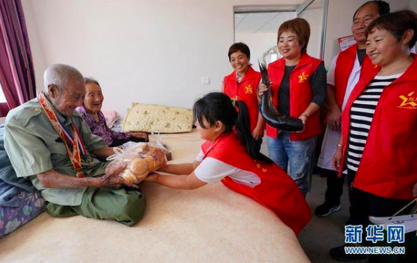 8月21日,志愿者给百岁抗战老兵王瑞成送来慰问品。 当日,河北省秦皇岛市卢龙县的志愿者和群众来到刘田各庄镇小王柳河村,慰问100岁的抗战老兵王瑞成,并送上祝福。王瑞成老人1944年参加八路军,作战英勇,多次负伤。 新华社记者 王毓国 摄