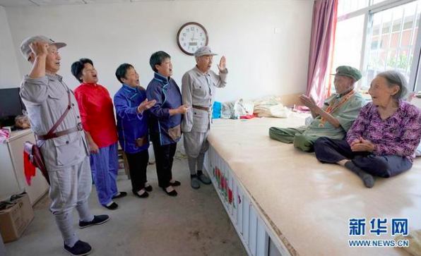 8月21日,小王柳河村老年欢乐文艺队的群众演员给百岁抗战老兵王瑞成表演革命歌曲。 新华社记者 王毓国 摄