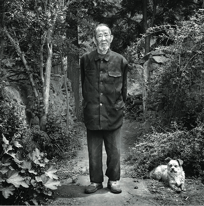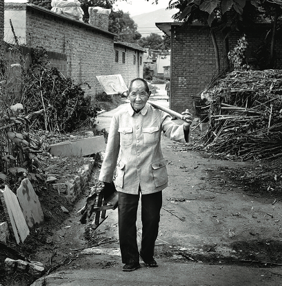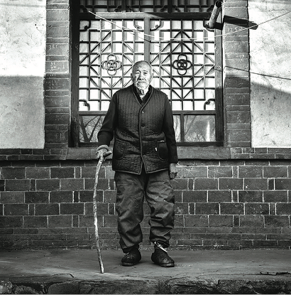 在平山县庞家铺村,李君放(右)为抗战老兵封清华拍照。