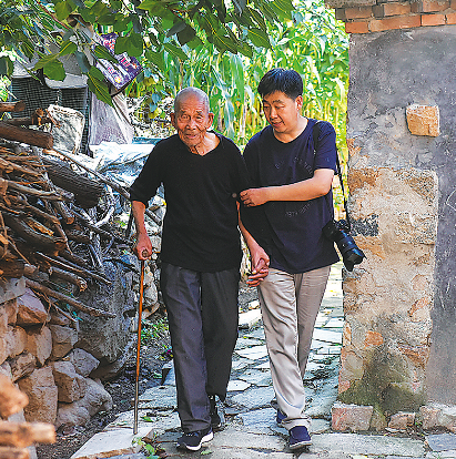 在平山县杏树台村,李君放(右)陪抗战老兵李文学散步。