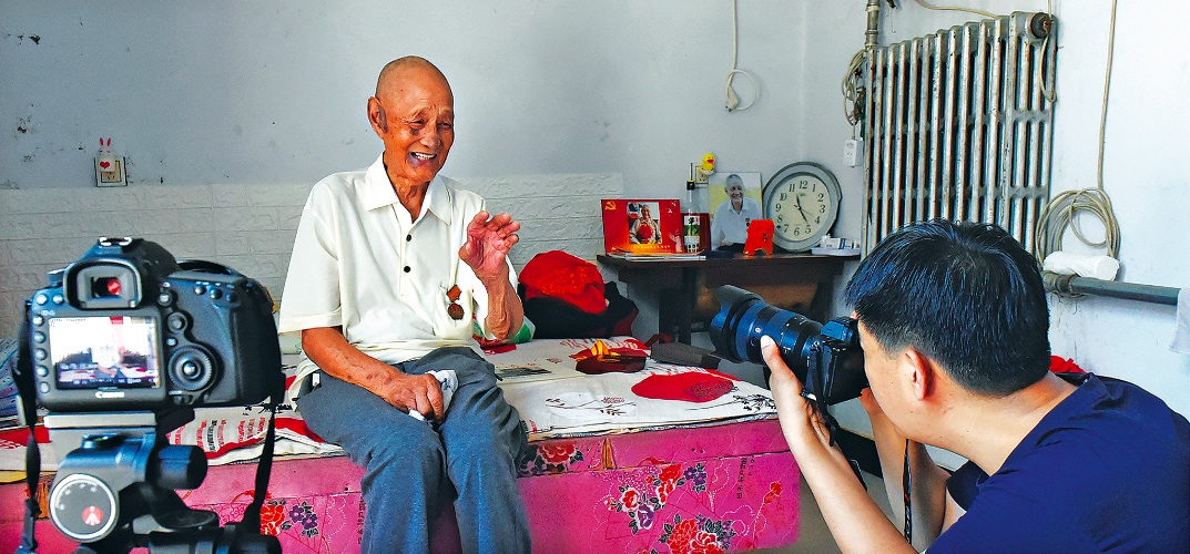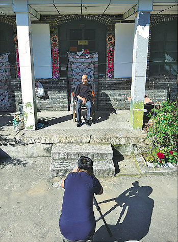 8月25日,在平山县杏树台村抗战老兵李文学家中,李君放为老人拍摄照片。