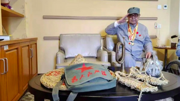 说罢,他举起颤巍巍的右手,面对镜头敬了一个军礼。