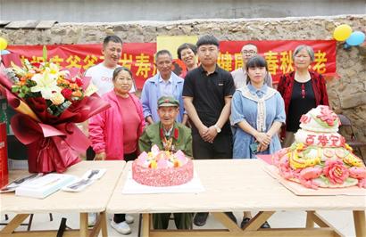 6月的夏天,宝山镇柳家屯里绿树与麦田交相辉映。昨天一早,庄子胜的亲人及西海岸退役军人事务局、社区工作人员和相关公益组织志愿者,一早来到庄子胜家中,为老人送上生日的祝福。生日蛋糕、鲜花以及写给老人祝福的话,让原本简朴的院子变得喜庆热闹。一切准备就绪后,儿子庄建亮把老人搀扶到主座上坐好。西海岸新区退役军人事务局相关领导向老人致以生日的祝福后,大家一同为老人唱起生日快乐歌。庄子胜满眼欣喜,在亲人的帮扶下,许下第一百个生日愿望。
