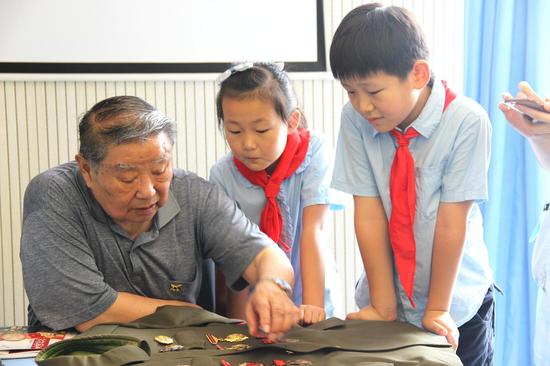 高尊理介绍,他16岁就参军,还加入新四军抗日。他回忆,“我们就躲在草丛里,用机枪伏击日本人,因为草丛太矮,我们只能突突突地打日本人的膝盖,把他们打得嗷嗷直叫。”绘声绘色地讲述,把孩子们逗得哈哈大笑,场面热闹。