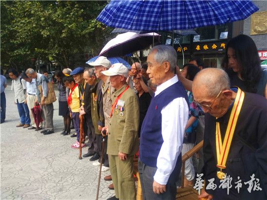9月30日,不少市民自发来到成都人民公园,向川军抗日阵亡将士纪念碑敬献花圈。当天下午2点,陈开义、郑维邦、钟华等6位白发苍苍的身影,也陆续出现在这里,向纪念碑敬礼、默哀。