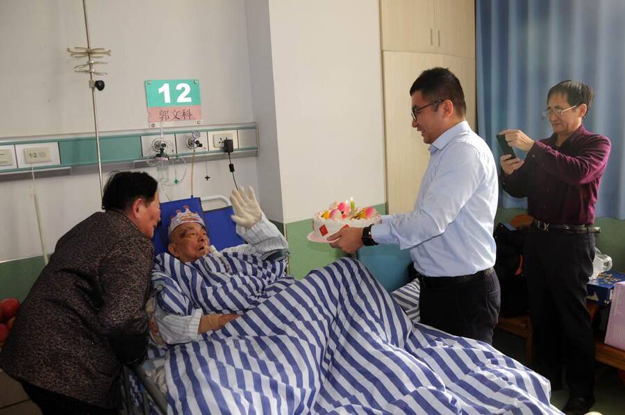 2月7日,郭文科满93岁,此时他已在南京军区总院和镇江359医院住了三个月了。全家人只能到359医院为其过生日了。一大早居住在扬州的赵桂枝就在女儿的搀扶下赶往镇江。