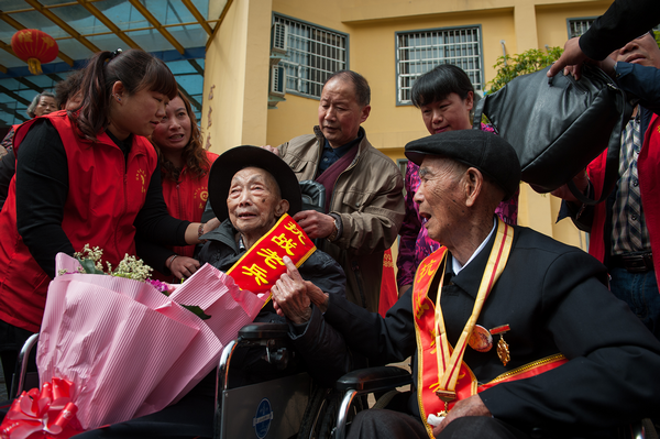 他们这一次生命中的相见,是平顶山、信阳两地关爱抗战老兵志愿者团队共同促成。在现场,河南关爱抗战老兵公益团队理事长“三乐”在接受媒体采访时说:我们河南省关爱抗战老兵公益团队致力于寻找、发现、关爱这些抗日战争时期的老战士老英雄,是因为他们不屈的抗争精神奠定了我们今天幸福生活的基础。前事不忘后事之师,民族强盛需要一代一代的人努力奋斗,更要让抗战精神永存!