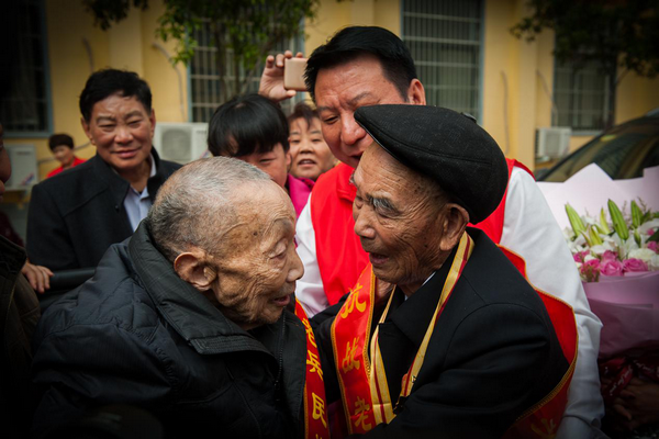 2018年4月14日,信阳市平桥区福利养老中心院内盛况空前,热闹非凡。两位昔日抗日战场上的战友在72年后相见,他们紧紧握住对方的手,声泪俱下,泣不成声,场面让人震撼,感动不已。