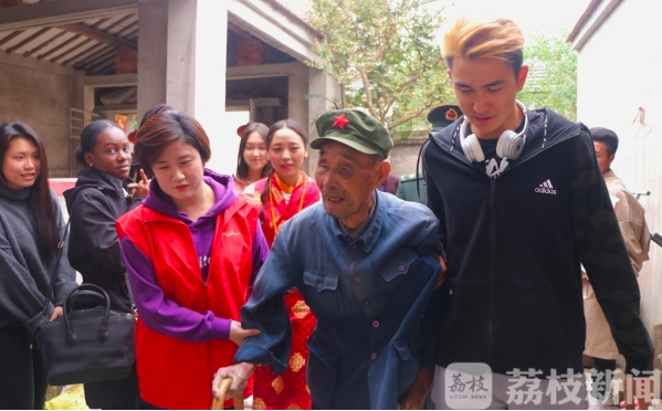 金秋十月,在重阳佳节来临之际,为了发扬中华民族敬老爱老的传统,让老人过上一个祥和的重阳节。昨天(10月15日),句容茅山风景区管委会和江苏农林职业技术学院茅山校区的大学生以及来自“一带一路”沿线国家交流大学生来到玉晨村,看望慰问了95岁的抗战老兵何忠志,给老兵送上一份祝福。
