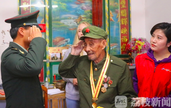 在何忠志家中,大家认真听着茅山风景区青年志愿者讲述老人的抗战故事,被他的事迹深深打动,曾在部队服过役的一位农校大学生更是深受感染,给老人敬礼表示致敬,两位军人互相郑重行礼,这一幕令人动容。临走之际,大家纷纷表达了自己对老人的祝愿,让他切身感受到了社会的关怀与温暖。