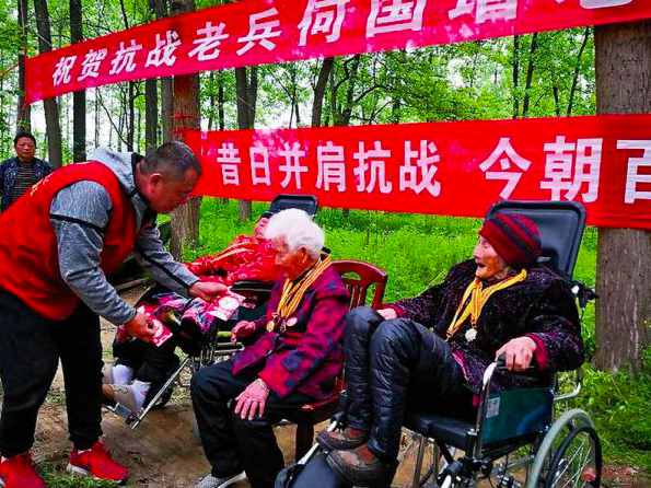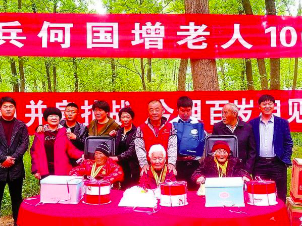 何国增老人的儿子请来剧团唱大戏, 庆祝母亲百岁生日之际与战友喜相逢。 附近十里八村的千余名乡亲也纷纷赶来为三位老人送祝福。