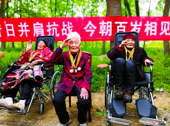 听着声声祝福, 三位老人不约而同地举起右手向大家敬军礼。 随后, 她们历经沧桑的手再次紧紧握在一起。