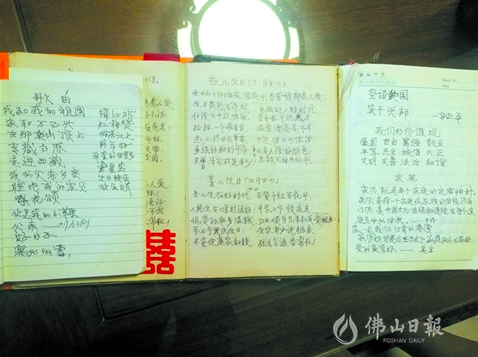 患病后,胡萍用左手写下的读书笔记和夫妻俩作的诗。/佛山日报记者黄碧云摄