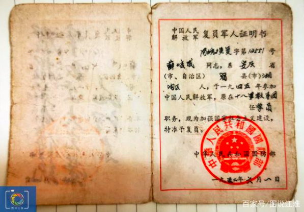 这是我的复员证书,那时候我的老家还属于安徽省宿县。1972年的时候,安徽省宿县军分区又重新给我换发了新的退伍证。我当兵后的第二年,1946年2月,张国华奉命率军冀鲁豫军区第7纵队一部,越过陇海线南下,与晋冀鲁豫军区第6军分区、华中第8军分区汇合,于12月12日成立豫皖苏军区。我家在皖北,属于当时的豫皖苏军区。