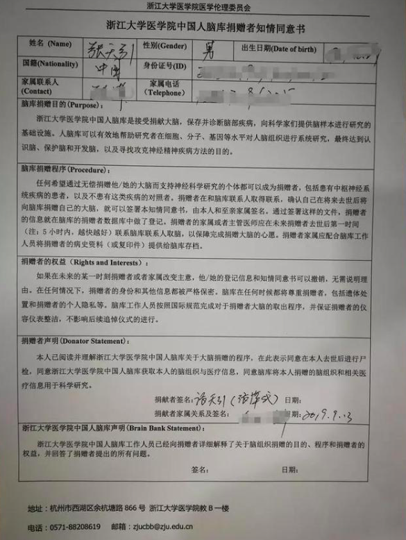 9月13日,张天引安然与世长辞。他的家人立刻联系了湖州市红十字会,并一起在遗体捐献表上签下名字。