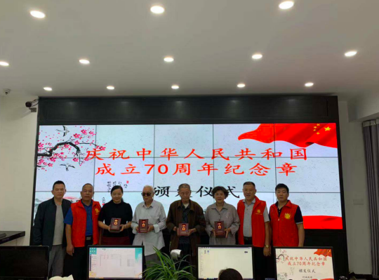 为庆祝中华人民共和国成立70周年,近日,盱眙县盱城街道在社会事务服务中心举办了为抗战老同志颁发“庆祝中华人民共和国成立70周年”纪念章活动,活动中为黄金永等11名抗战老兵颁发了纪念章。