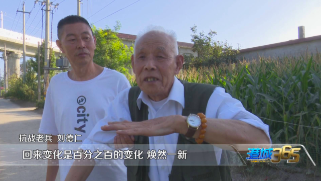 抗战老兵刘德仁:回来变化是百分之百的变化,焕然一新,交通也变化了,水利也变化了,文教卫都变化了,城市也变化了,原来灌南县是很小的一个城市,现在回来有原来四个那么大了,原来这边没有汽车,现在家家都有汽车了,这是县委领导的结果,中央的好政策,改革开放的结果。