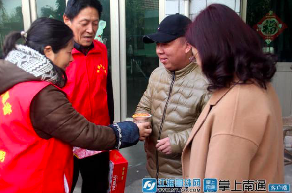 12月30日上午, 市区天生港街道泽生社区居委会3楼会议室里暖意融融,爱国拥军莫文隋爱心粥团队正在这里为100多位老人免费发放腊八粥。今年74岁的杨锡妹是绳网厂退休人员,她领到一份腊八粥后高兴地说:“腊八粥虽然价值不大,但是情意深。谢谢社会上好心人对我们老人的关心。”
