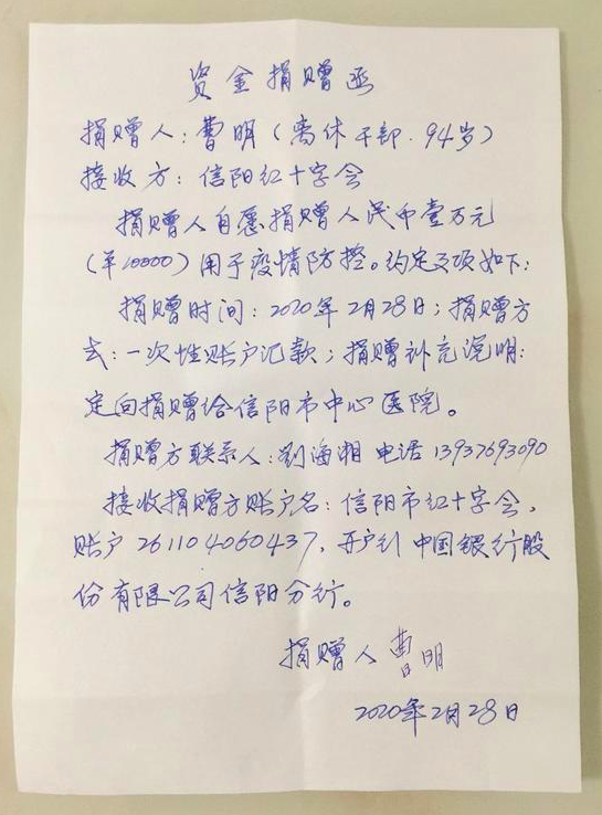 今天,信阳市中心医院收到了一份沉甸甸的抗击疫情爱心捐赠。这笔10000元的捐赠款由市红十字会定向转赠中心医院。这笔捐赠款的落名处写着捐赠人:曹明,一位抗日战争年代的卫生老兵。