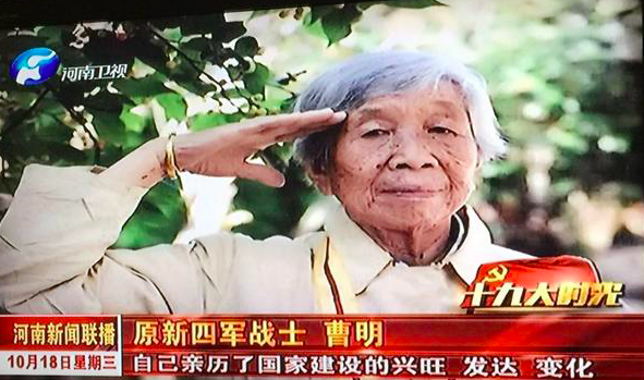 据了解,曹明同志生于1926年2月,江苏省阜宁县陈集镇胡庄村人,1943年7月参加新四军,从此由一名穷苦的女童工走上了革命的道路,跟随共产党在苏北开展抗日游击战。当时老人在新四军三师卫生部当护理员,她怀着满腔的热情投身革命,勇敢的冲上前线,用瘦弱的身板背伤员、抬担架、清洗包扎伤口、协助医生为受伤战士做手术。1945年抗日战争胜利后,又跟随部队奔赴东北战场参加解放战争,先后参加了辽沈战役、四平保卫战等战役。1946年光荣加入中国共产党。1949年参加南下干部纵队,1952年奉调到海南岛、上海等地学习工程建设知识,参加军事设施修建。1955年转业到地方医疗卫生战线岗位,1983年从原信阳地区人民医院(现信阳市中心医院)离休。