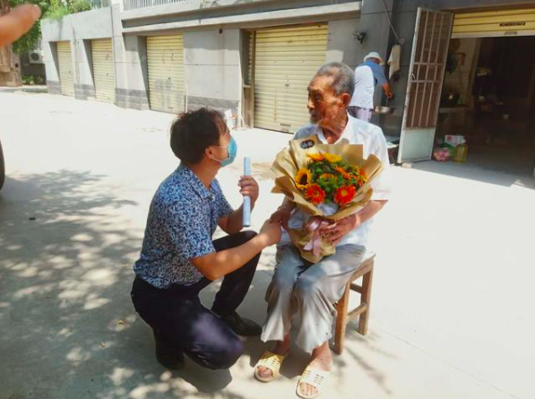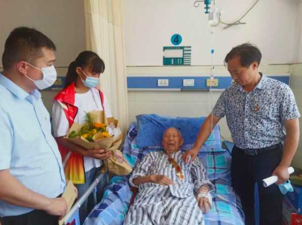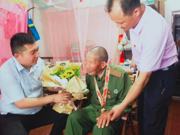 95的抗战老兵老党员李长法,虽然身体不好,躺在病床上,但当讲到1945年初他只身带着炸药包炸毁日军大队部时,依然激情澎湃,他拉着志愿者们的手说,有国才有家,现在我们国家富强了,国家对我很照顾,每月领着养老金,看病还不花钱,我很满足,希望孩子们不要忘记,我们今天幸福生活来之不易...
