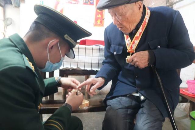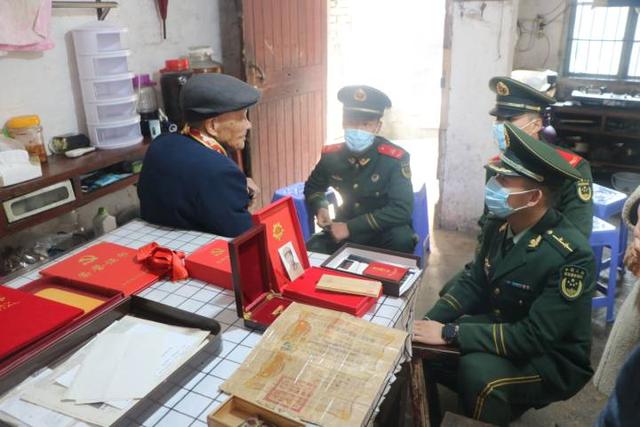 老人向官兵讲述纪念章背后的故事