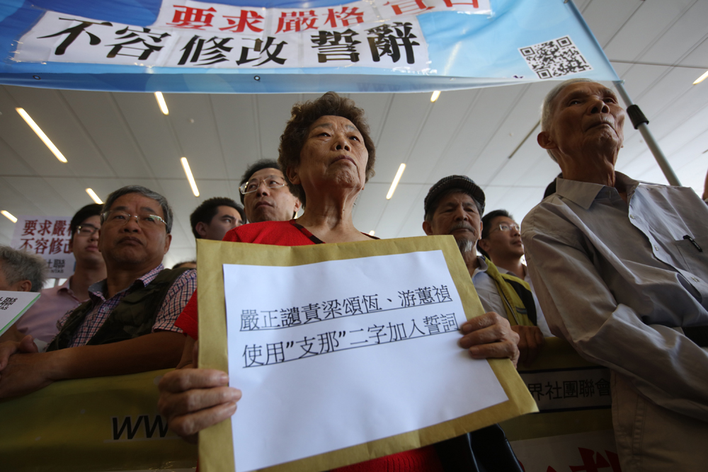 香港新界社团联会、原东江纵队港九独立大队老游击战士联谊会、新界青年联会等约百人昨日到立法会请愿,对青年新政梁颂恆、游蕙祯于立法会宣誓仪式上,加入辱华字眼“支那”及粗口表达强烈不满,炮轰二人侮辱及歧视中国人,促“青政”收回辱华言论。有抗战时期的老兵更对两人行径感到愤怒及心痛,要求取消其议员资格。