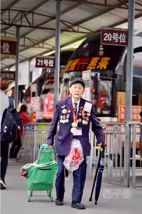 社交媒体文章介绍道,这位94岁老人魏瑟是“东纵抗日老战士”,只身挂尿袋从香港出发到惠州,说要为战友扫墓。(社交媒体报道截图)