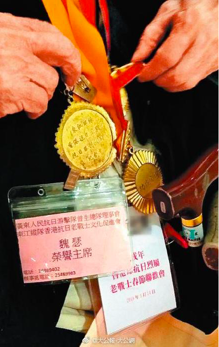 报道称,这名“老兵”对记者声如洪钟继续讲“英勇事迹”:“我中过三次枪,有颗子弹留在肚里,营救那晚我背着何东的孙子过粉岭条桥,三尺水深、两个哨站,我们救了文化界、爱国人士一千四百九十多人。”魏瑟称,当年只有十九岁的他,已负责六个小组的情报,获配备两支短枪一支长枪在游击队抗日“打仗”。