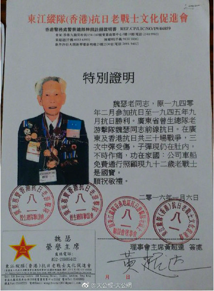 据香港《大公报》6日报道,这位自称是东江纵队老兵的老人魏瑟,四年前开始活跃于香港多个纪念活动,今年四月一间拍卖公司联同以他创立的“东江纵队文促会”,以东江纵队的名头搞拍卖筹款。